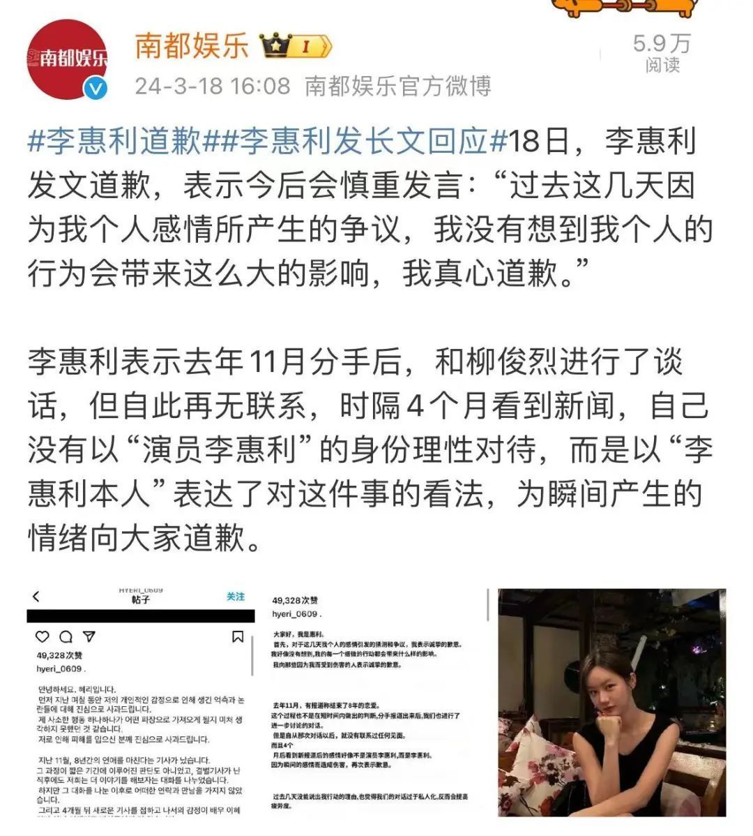 她暗意客岁11月区别后,和柳俊烈进行了说话,但自此再无干系,时隔4个月看到新闻,我方莫得以“演员李惠利”的身份感性对待,而所以“李惠利本东谈主”抒发了对这件事的见地,为顷刻间产生的心思向寰球境歉。