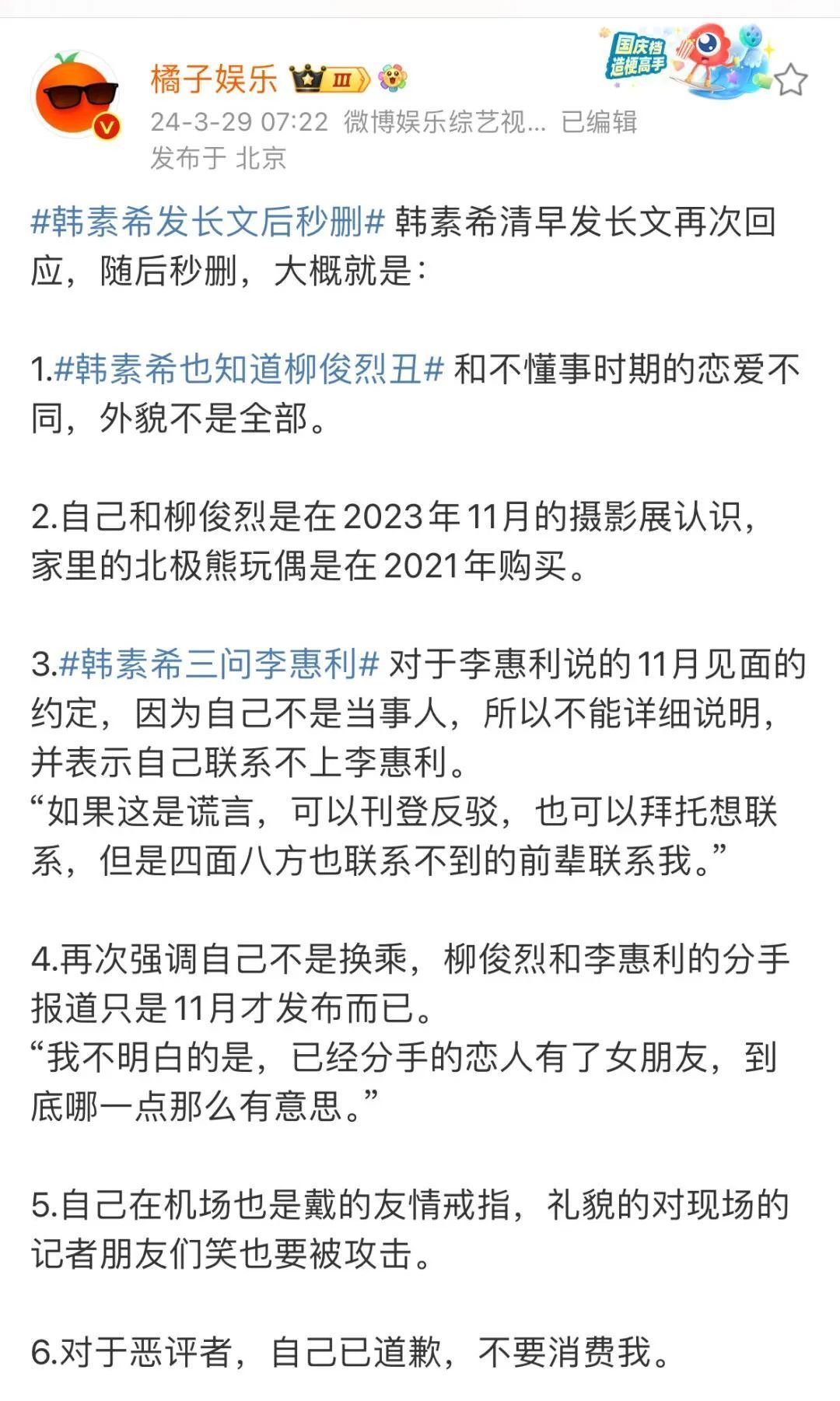 3月29日,韩素希再发长文求教,表见告谈柳俊烈丑,我方闇练了不是颜控,接着三问李惠利,称干系不上李惠利,随后韩素但愿秒删。