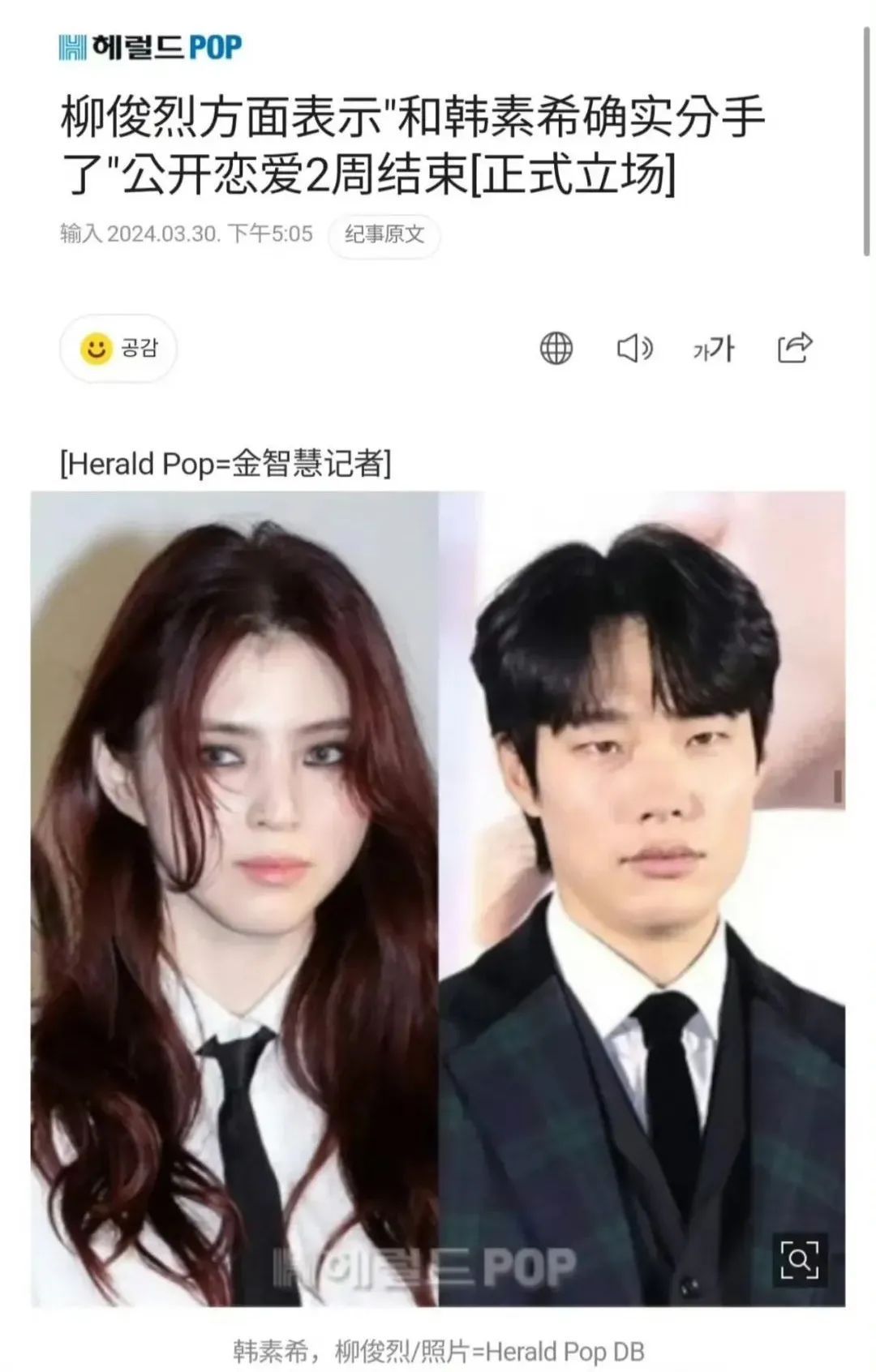 还有一双公开后极速掰了的明星——韩素希和柳俊烈,认爱半个月分了。