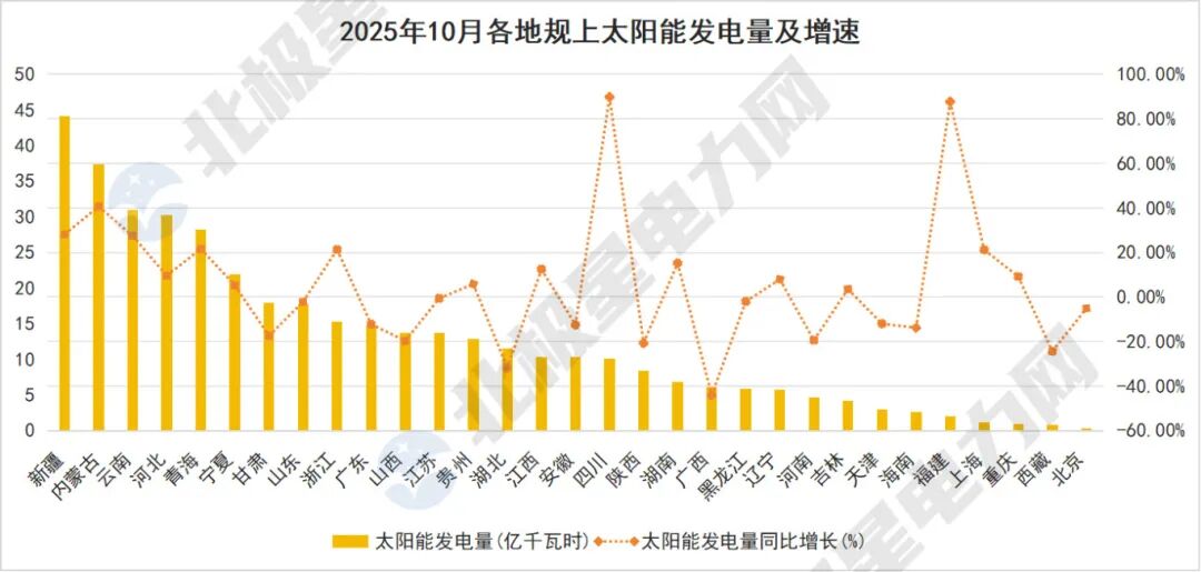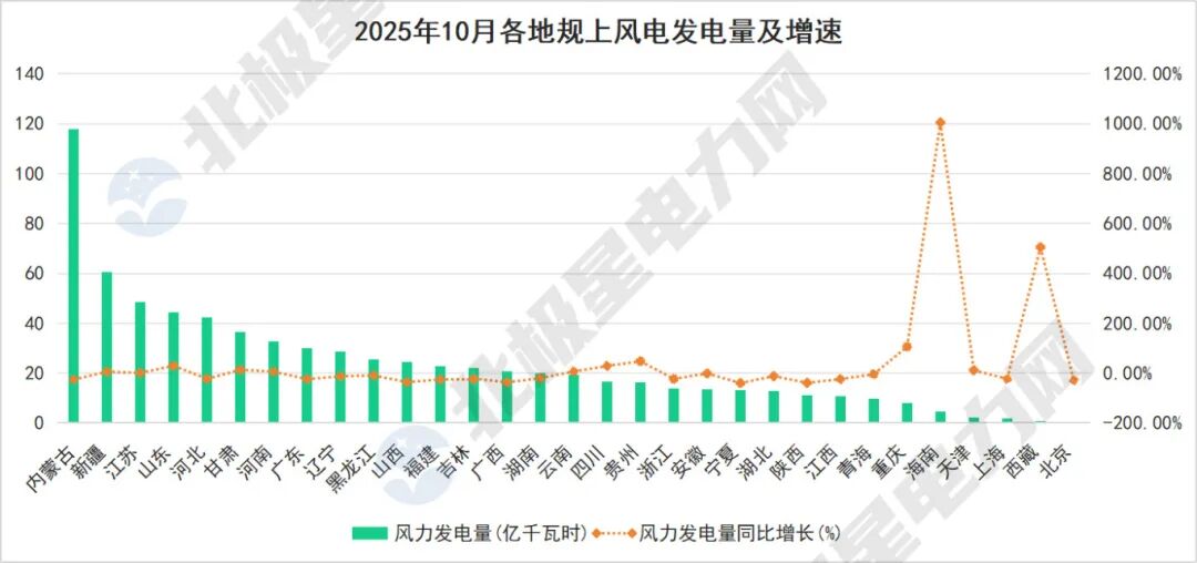 内蒙古与新疆分离在风电与太阳能发电范围领跑,值得珍贵的是,两地的太阳能发电均增长彰着。2025年10月,新疆规上太阳能发电量同比增长28.10%,内蒙古同比增长40.70%。海南省风电增速高达1005.1%,诚然基数较小,但涌现出宏大发展后劲。